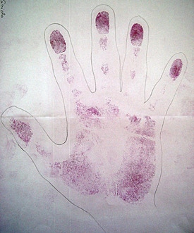 Untersuchung der Schweisssekretion (vegetatives Nervensystem) durch Anfärbung des Schweisses der Hände / Füsse auf Papier.